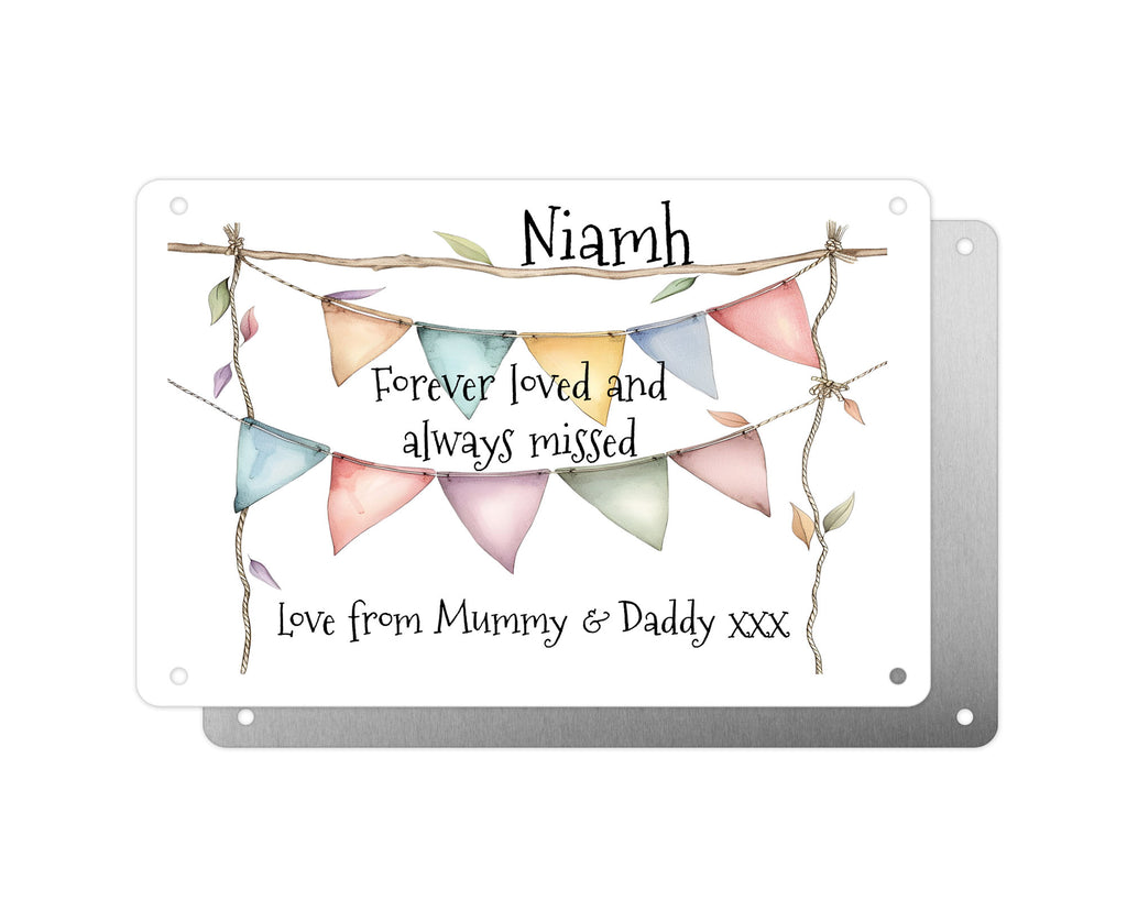 Featuring a leafy bunting design, this metal sign allows you to personalise it with a name and a special message, making it a heartfelt remembrance gift that expresses your love and condolescences beautifully.