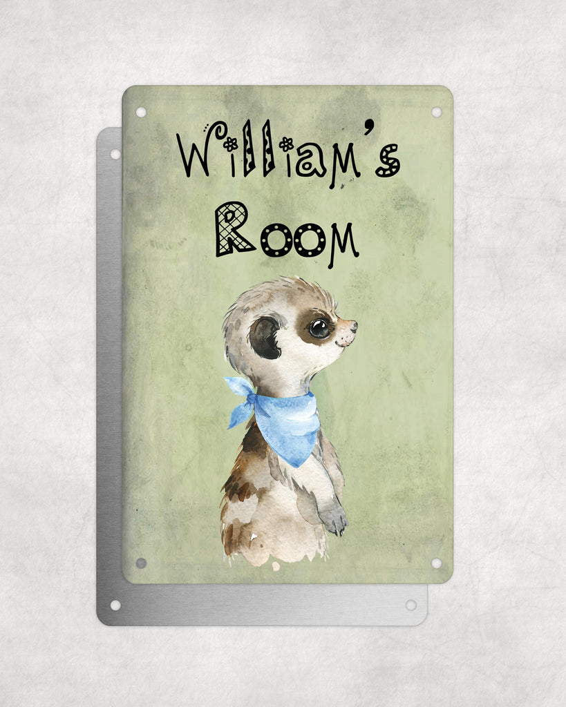 Cute Animal Personalised Name Plaque – Baby Meerkat Sideview With Blue Neck Tie | Vintage-Style Green Aluminium Sign for Kids’ Room