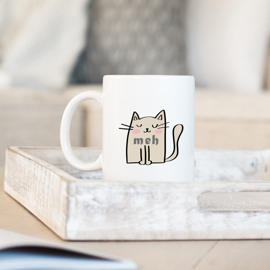 Meh, Funny Birthday Gift with Cream Cat Design, Personalised Mug