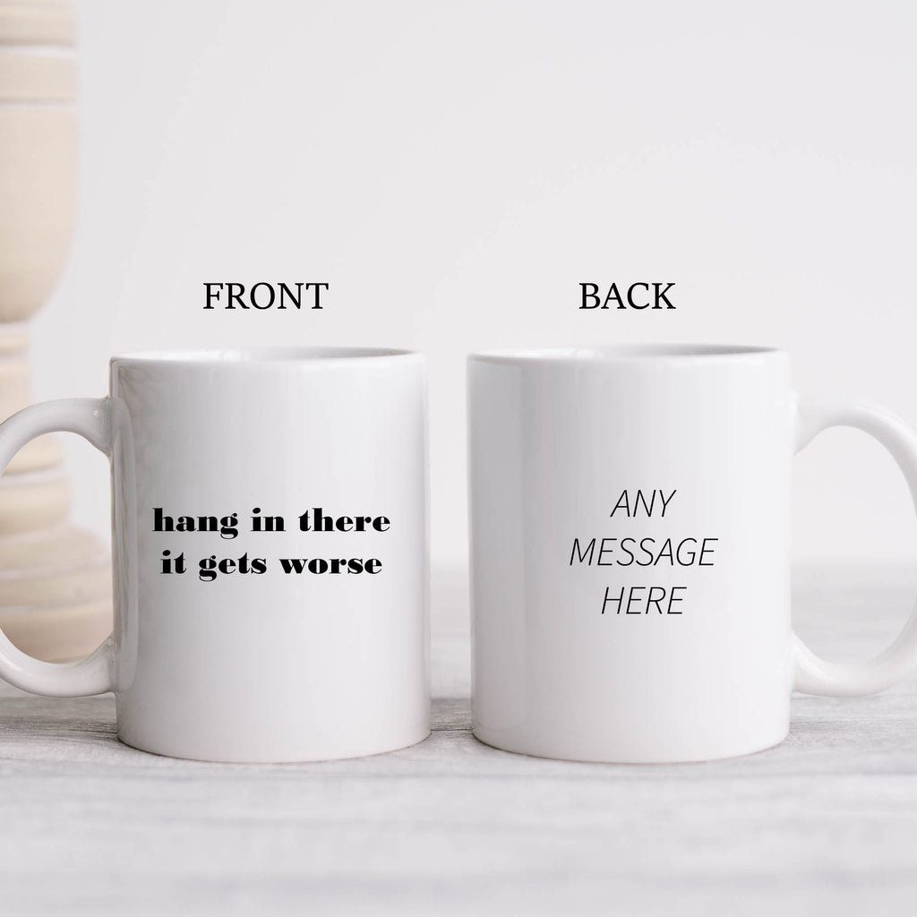 Hang In There It Gets Worse, Funny Sarcastic Office Gift, Personalised Joke Mug