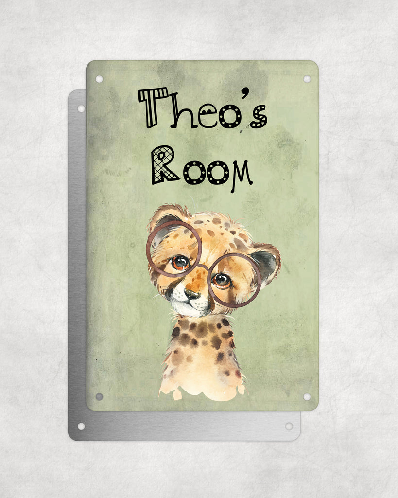 Cute Animal Personalised Name Plaque – Baby Cheetah With Brown Glasses | Vintage-Style Green Aluminium Sign for Kids’ Room
