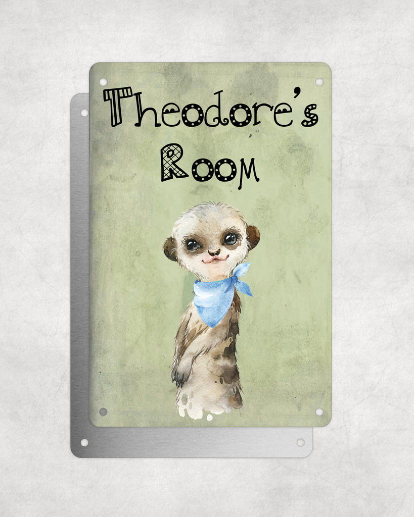 Cute Animal Personalised Name Plaque – Baby Meerkat With Blue Neck Tie | Vintage-Style Green Aluminium Sign for Kids’ Room