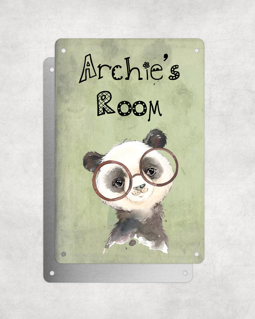 Cute Animal Personalised Name Plaque – Baby Panda With Brown Glasses | Vintage-Style Green Aluminium Sign for Kids’ Room