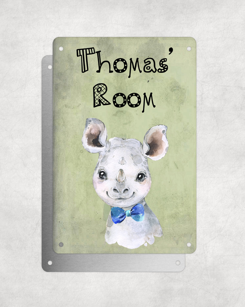 Cute Animal Personalised Name Plaque – Baby Rhino With Blue Bow Tie | Vintage-Style Green Aluminium Sign for Kids’ Room